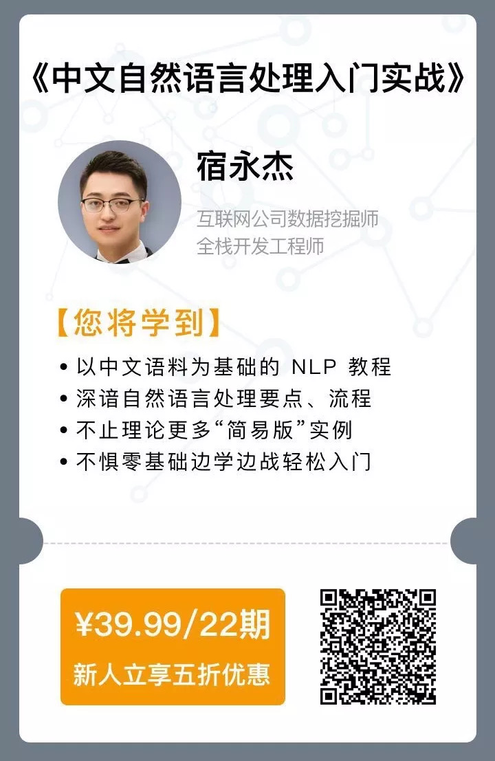 宿永杰已经在 GitChat 开设了《中文自然语言处理入门实战》课程。目前共有21期课程。