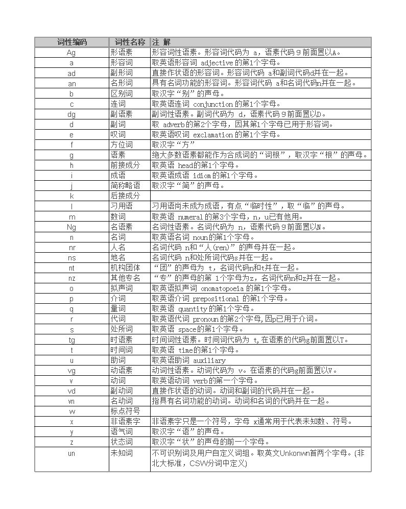 比如,常见的文本分类就不用关心词性问题,但是类似情感分析、知识推理却是需要的,下图是常见的中文词性整理。