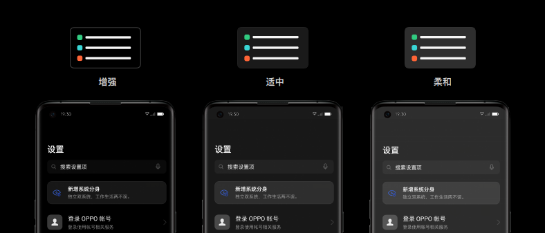 比如在 Google 的设计语言中深色主题的对比度应当符合无障碍规范,但原生 Android 的深色主题依然自相矛盾地使用了纯黑色作为背景;ColorOS 11 在此基础上设计了增强、适中、柔和三个暗色模式层级,相比原生 Android 以及市面上大部分只是简单「抄作业」的定制系统体验更加友好。