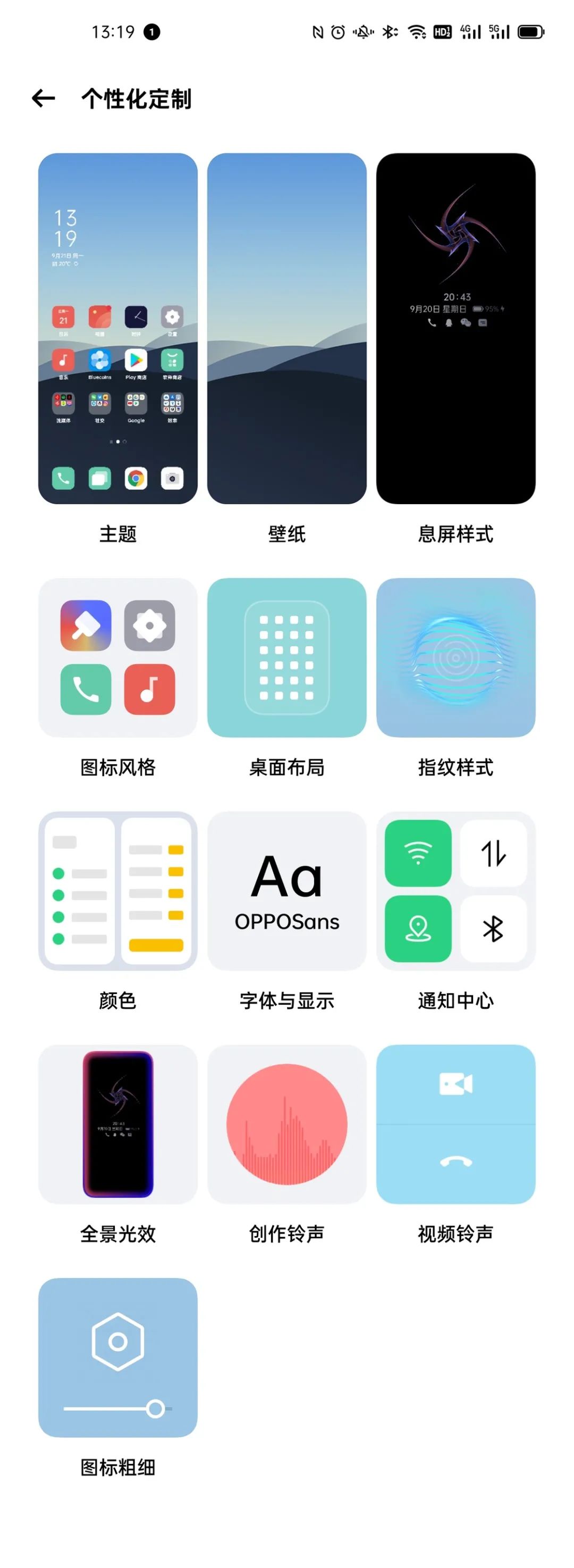打开「系统设置 > 个性化定制」,我们能在这里看到 ColorOS 11 所支持的 13 项个性化定制内容,大到主题、壁纸、息屏,小到 UI 配色、铃声、工具栏图标都有覆盖。