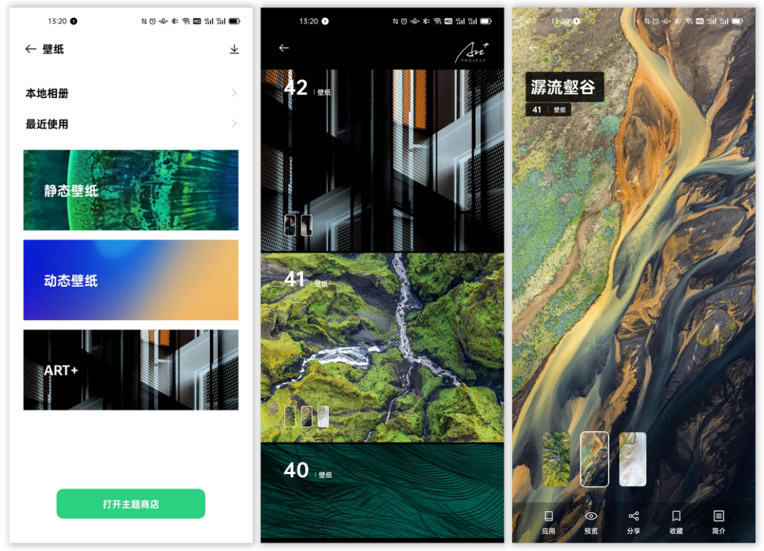 可用于壁纸设置的类型也更加清晰了,这里尤其值得一提的是,如果你实在「壁纸荒」找不到满意的图片,ColorOS 独家的 ART+ 系列壁纸也收纳在内,截至发稿,ART+ 已经围绕不同的文化、主题和意象更新了 42 组质量上乘的壁纸图案,搭配我手里在用的 Find X2 Pro 的曲面屏视觉冲击非常强烈。