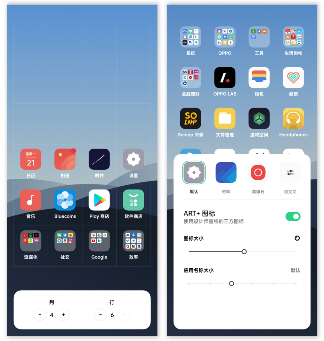 图标样式方面,除了此前已经加入的默认、材料、鹅卵石三种默认图标风格和自定义图标样式外,这次 ColorOS 11 还额外增加了「应用名称大小」调节;类似的,ColorOS 11 对桌面布局的行、列设置也进行了重新设计,同样采用主屏实时预览加上底部调节控件的设计,使用起来更加直观顺手。这两项设定一般是第三方启动器或者第三方定制系统才会做的,可见 ColorOS 开发团队在细节上的思考相当细腻。