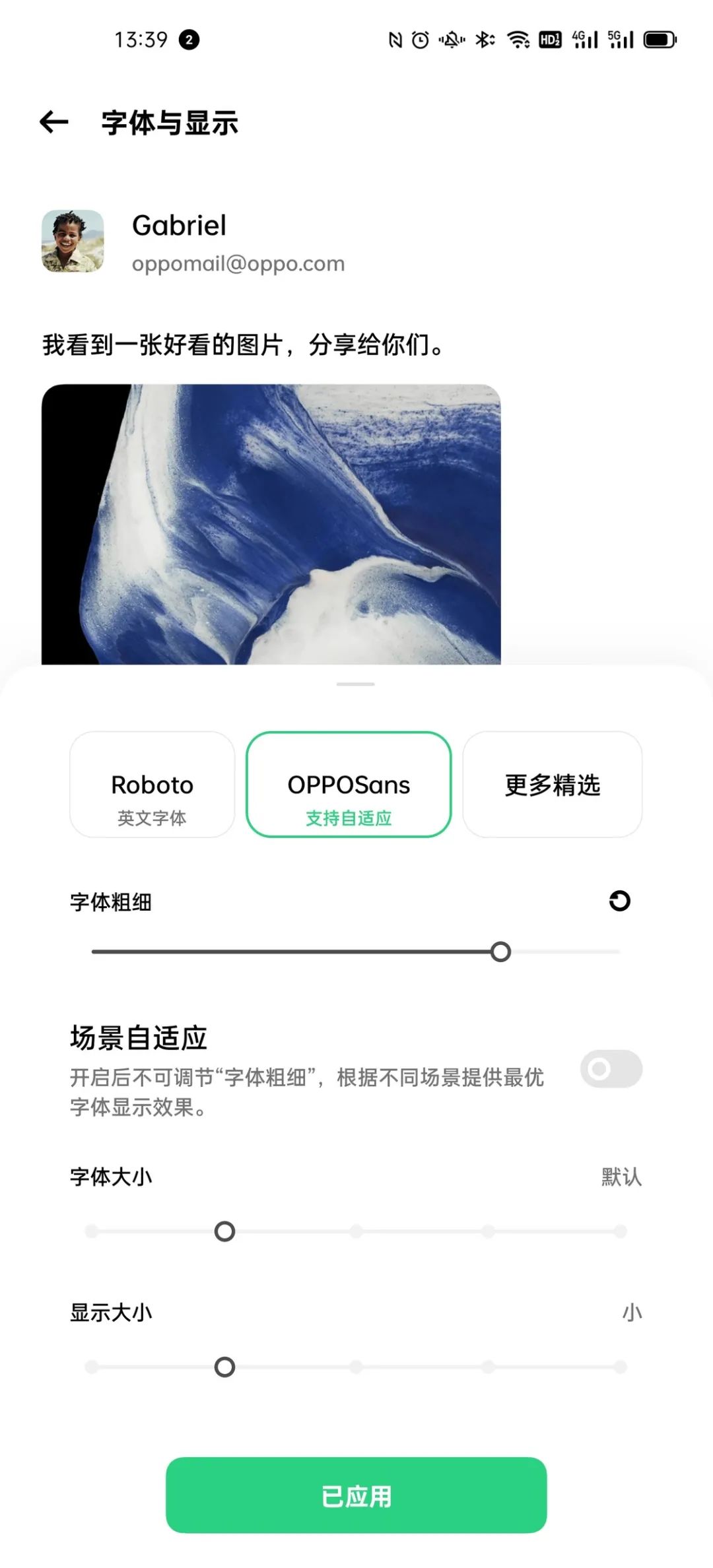OPPO 的品牌定制字体 OPPO Sans 也随 ColorOS 11 迎来重要更新。ColorOS 11 搭载的 OPPO Sans 2.0 终于引入了无极调节支持,除了根据不同场景自适应调节字体粗细外,我们也可以在字体与显示设置中根据个人喜好随意调整。