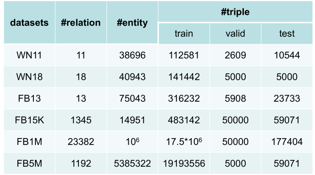 对训练好的词向量有如词相似度、词类聚、各种下游任务的评测方法。如何来评测知识表示学习效果的好坏,其中主要有两个任务,链接预测和三元组分类。
