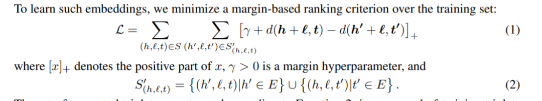 其中,S是正确的三元组,S’是通过替换 h 或 t 所得错误的三元组。γ 是间隔距离超参数,[x]+表示正值函数,即 x > 0 时,[x]+ = x;当 x ≤ 0 时,[x]+ = 0 。
