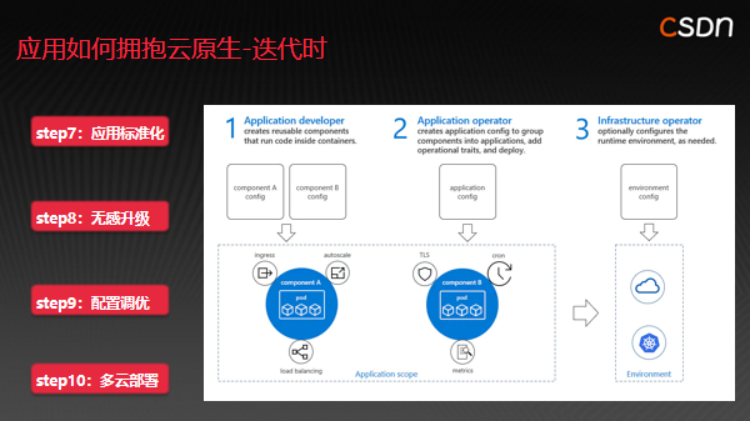 第七步,应用标准化。在经过标准化构建和运行容器承载之后,应用与应用之间只有细微的差异跟资源不同,配置不同,规模化管理所有的应用服务和服务治理,依赖拓扑等等。