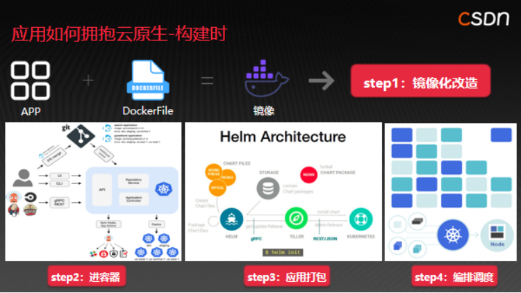 第三步,应用打包,通过Helm,将这些依赖打包进同一个package实现整个应用包管理,并可在容器化环境里快速部署。