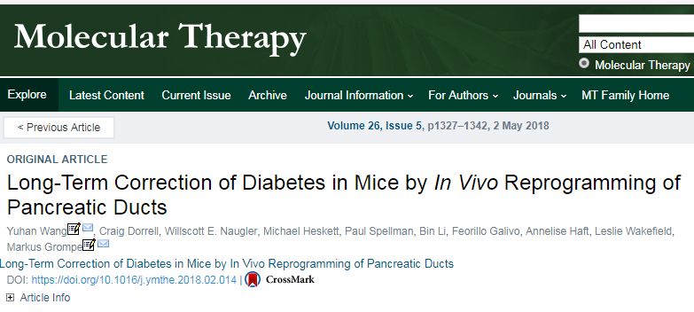 这项研究以 “Long-Term Correction of Diabetes in Mice by In Vivo Reprogramming of Pancreatic Ducts”为题发表在5月2日的《Molecular Therapy》杂志上。