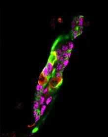 Injection of an adenoviral vector encoding pancreatic transcription factors induced insulin expression (red) in mouse pancreatic ducts. Ductal tissue is shown in green and nuclei in blue.YUHAN WANG