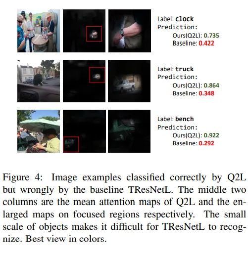 而跟Baseline的对比可以发现,Query2Label方法的注意力区域更加集中、更加准确,引入了更少的无关背景。