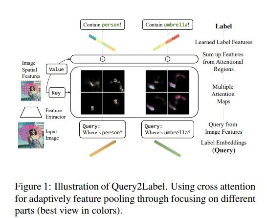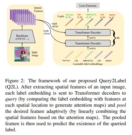 首先框架上,Query2Label是一个两阶段框架,第一阶段将图片通过一个骨干网络提取特征图,第二阶段将图片特征和标签特征一起送入Transformer解码器中,图片特征作为key和value,标签特征作为query,将Transformer输出的query特征经过自适应特征池化和线性投影后预测标签存在性。