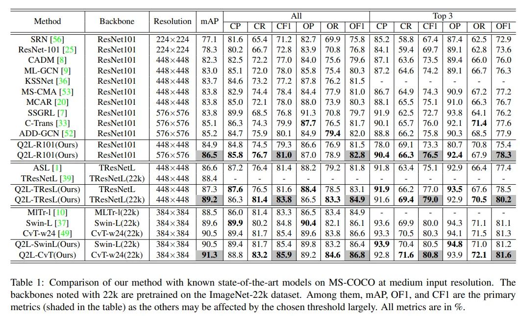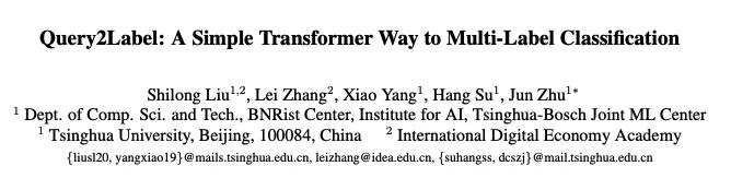 随着Transformer模型在视觉领域的成功,由于其所具有的各种优秀的性质,本文作者将其应用到了多标签图像分类任务中,提出了Query2Label方法,使用Transformer解码器来查询每个标签的存在性,由于其框架简单且性能强劲,在多个公开数据集上取得了SOTA,在比较具有代表性的MS-COCO数据集上,2020年的SOTA方法mAP为88.4%,而本文取得了91.3% 。