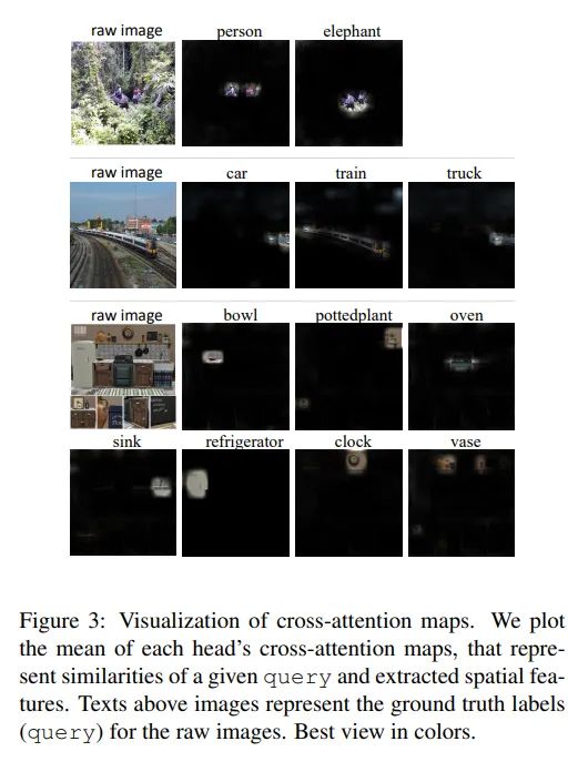 通过对交叉注意力图进行可视化,我们可以看到不同标签特征可以很好地捕捉到对应目标。