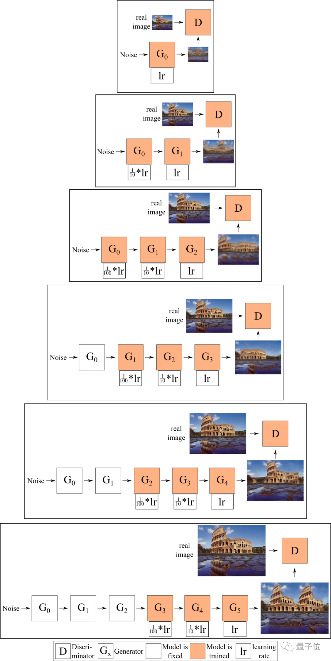 下图就展示了使用这两种方法实现的模型。默认情况下,最多同时训练3个生成器,并对较低的生成器,分别将学习率调至1/10和1/100。