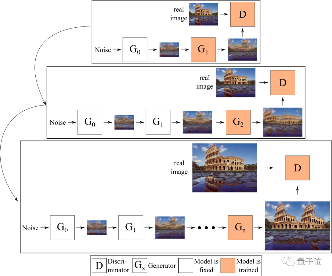 而在Adobe与汉堡大学的研究人员发现,在给定的时间内仅能训练一个生成器,并将图像(而不是特征图)从一个生成器传输到下一个生成器,这就限制了生成器之间的交互。