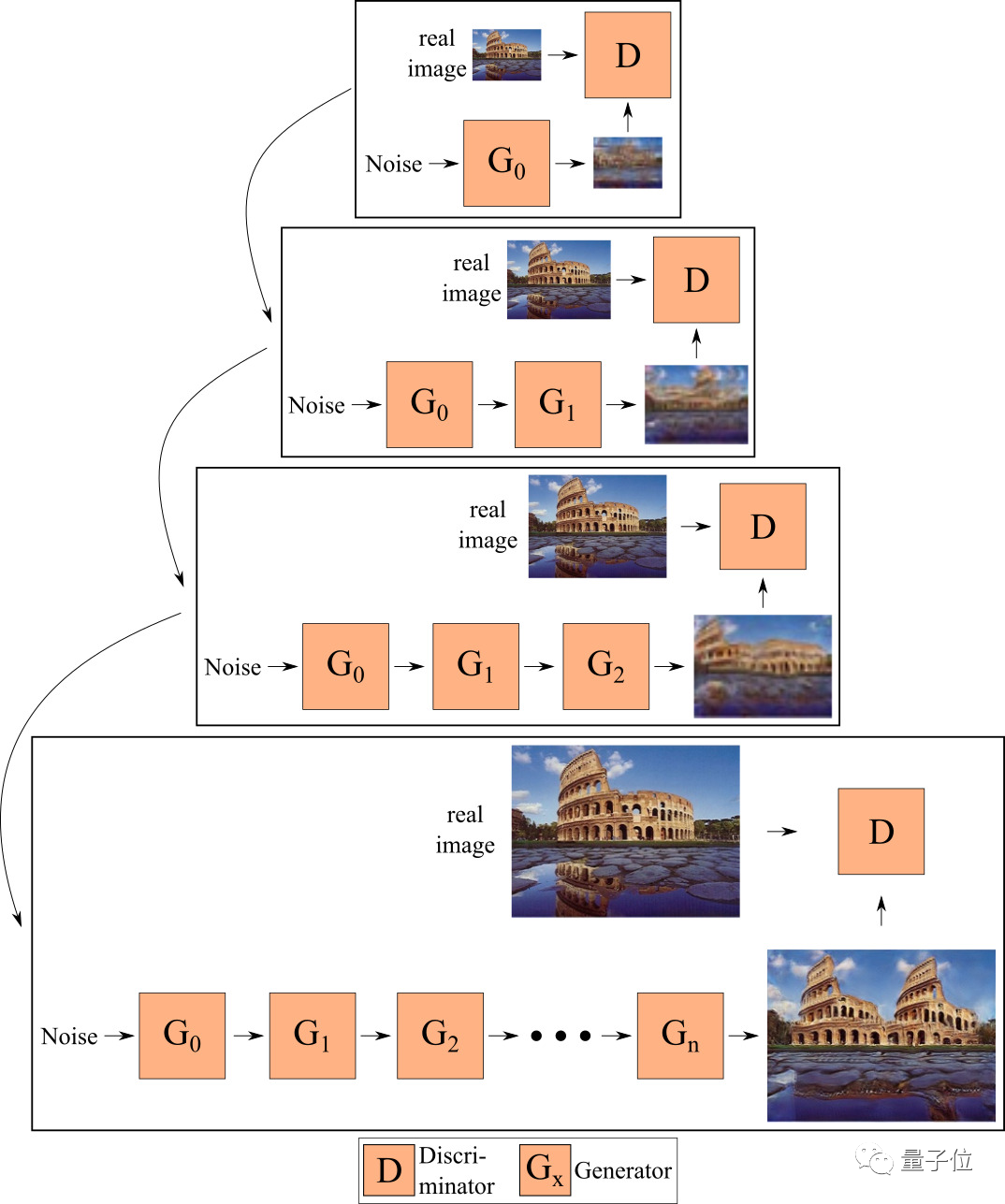 在更高分辨率上工作的生成器,将前一个生成器生成的图像作为输入,在此基础上生成比当前还要高分辨率的图像。
