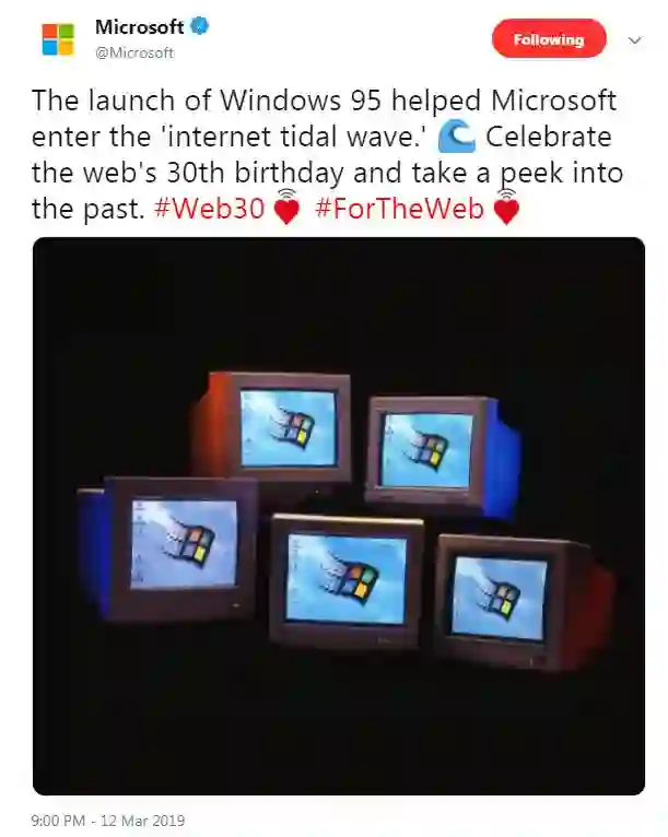 因此,微软也在 Twitter 上庆祝 Web 30 周年,并表示 WIndows 95 的发布帮助微软进入到了互联网浪潮。