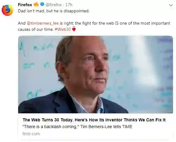 由于 Tim Berners-Lee 被称为 Web 之父,因此 Firefox(作为 Web 的参与者之一)在 Twitter 上表示:父亲没有疯,但是他很失望。同时,Firefox 也赞同他在文章说的这样一句话: