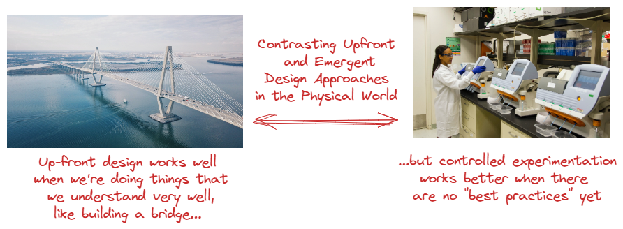 如果我们正在处理一些东西是全新的,并且我们不太了解,或者变化太快以至于还没有“最佳实践”,那么预先设计就不起作用了。在这种情况下,作为科学革命基础的可控性实验可以帮助我们更深入地理解问题和可能的解决方案。最终的解决方案“出现”了,只是它沿着有意识的实验的路径向我们招手。