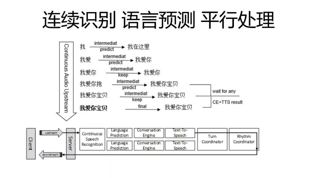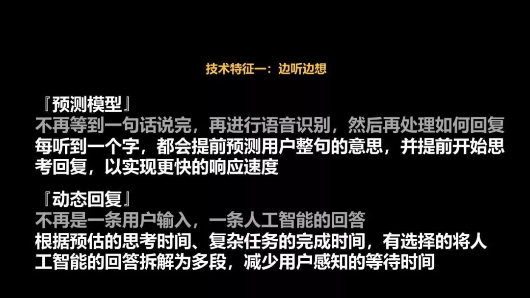 第一大技术特征,我们管它叫边听边想,也就是说不等一句话说完,再进行语音识别。传统的说,因为以前其他的是我攒够了一个消息,把语音消息发过来再进行识别。可是大家想,人和人之间的交流其实不是这样的,我们在开会的时候,通常老板的问题问到一半的时候,我们已经在开始琢磨该怎么回答了,这样老板语音刚过,我们就可以把答案很流畅地给出来。这个才是人和人之间交流的方式。对于人工智能也一样,当我交互的方式不再是一个语音消息,而是一个语音流的时候,我就不应该再等到一句话都说完了再进行思考,应该随时去思考,它听了一半的话就开始去预测这整句的意思是什么,这样它就能以更快的速度把这个回答给出来,而且能实现很多动态的预估。这是其中的一个重要的技术特征。