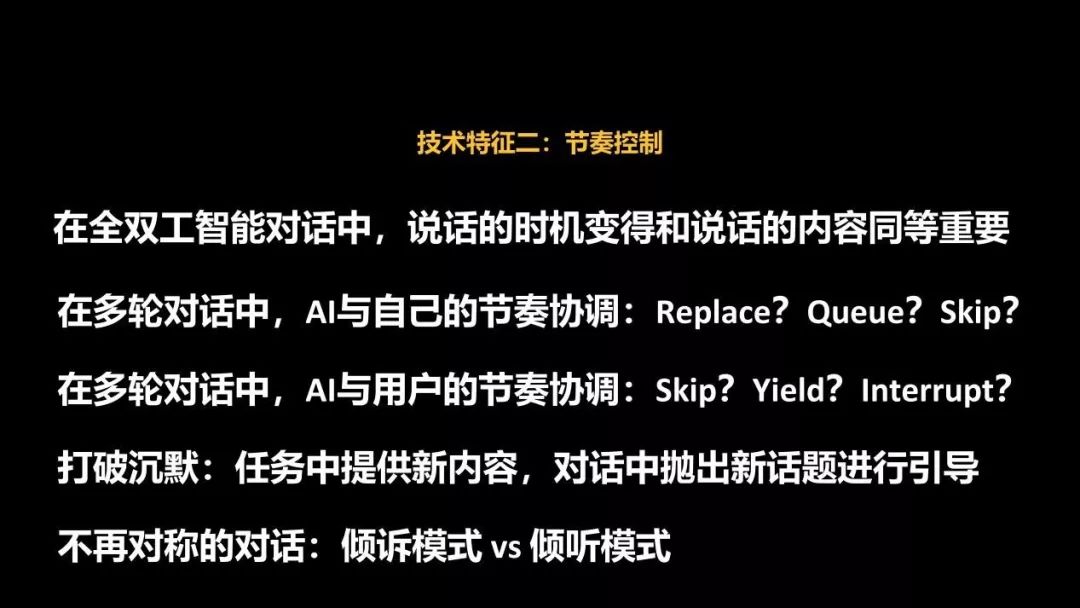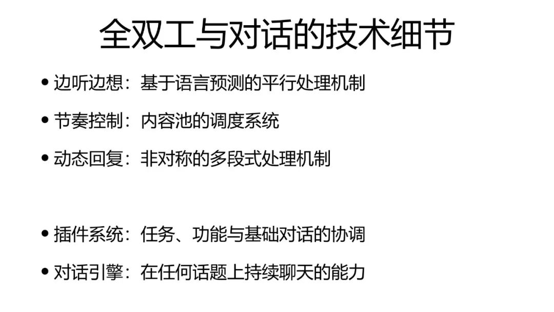 刚才黑色的部分其实更多的是给大家介绍了像产品经理也都会感兴趣的,比如对于全双工的一个新的产品形态,它能为人机语音交互带来怎样的不同?它实际上是一个更加复杂,但是拥有更高天花板的一个交互方式。后面我会在剩下的时间,再尽量多讲几点,就是白色底色的就是给技术人员看的更多的全双工的对话技术的细节。