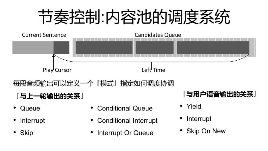 下面一个图解释了说我们如何进行一个节奏控制?事实上我们会把机器现在正在说的话和未来可能要说的话建一个池子,然后它就像有一个播放的指针一样,不断地从这个池子里去拿音频的针,去塞到那个连续的流里。然后每出来一个新的话的时候,我们会通过各种各样不同的输出关系来决定说,我这句话是应该放到播放的最前面,还是应该放到排队的池子里,还是应该直接扔掉?有了这样一个内容的池子的话,我们就可以保证一个稳定的对外音频的输出。这个是节奏控制的方法。