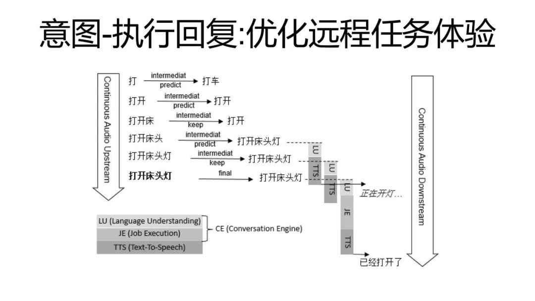 类似的,尤其是在远程的智能家居控制的时候,还有另一种方法,我们叫意图-执行回复。就是在听到中间结果的时候,可能我知道是打开床头灯,但是我事实上如果真正想要把这个床头灯打开,这是一个非常复杂的联动,我需要通过很多的服务器,从云端落到你家里的路由器,然后再由路由器把你的智能家居打开,这是一个非常漫长的过程,通常需要两三秒都是很正常的。对于人工智能来说,这两三秒我再回答,这会让用户说觉得你到底听没听清我?微软小冰在全双工使用的方法是:我首先只要识别出你的意图,那么我不尝试真正执行它,我就先给一个对于你的意图的回复,就是说我先试试或者说我正在开灯,然后等我的智能操作真正完成了,我拿到了它的智能设备传回来的返回设备码的时候,我再告诉他说,你家的智能电视已经打开或者说那个智能电视现在处于离线状态无法打开,再把真正的结果告诉他。所以一个问题事实上我可以拆成两步答案再去回答,这是一种非对称的交互。