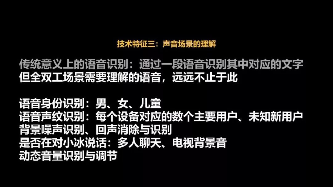 第三个在全双工中的一个技术特征就是传统意义上我们对语音识别的理解,就是我们听到了一段语音,我们要识别这个语音中所包含的文字,但事实上,在一个真正的全双工语音的环境中,也就是说对于一个人的听觉的理解能力来说远远不止于此。比如说我们要有对身份的识别,有对声纹的识别,这句话是我爸爸说的,还是我爷爷在说,还是我儿子在说。还有对背景噪声的识别,还有回声消除,然后还要判断它是不是在和人工智能对话。
