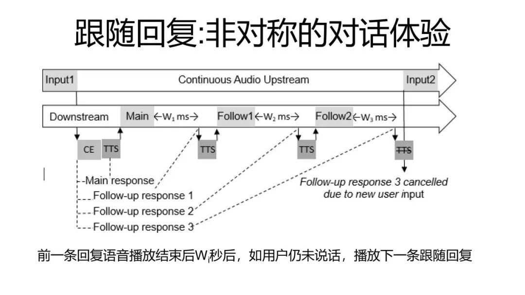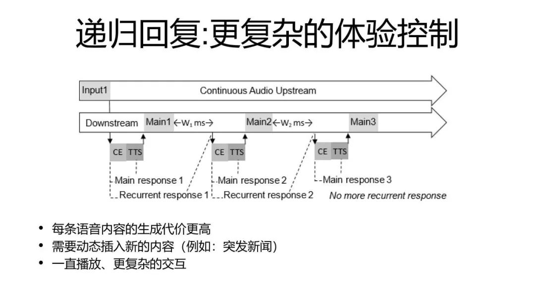 最后还有一种方法是递归的回复,事实上你可以每一次回答完成了之后,如果用户沉默了的话,我可以再向服务端发送一个请求,我再去拿到一些新的内容。这个跟前面这种跟随回复的主要不同在于跟随回复你是一次把所有的结果都拿到了,它是一个一个播,这样它就没有动态调整的能力。而后面这样的方式,每一次其实它都是一个新的计算,比如我在进行一个新闻的播报的话,我就有机会能够插入一些突发的新闻或者说完成一些更复杂的交互。这些都是我们在全双工的技术中引入的一些全新的方式,它也就让我们人和机器之间的交流,从原来这种一问一答的简单交互,可以变成一种可以一对多的或者多对一的一个更复杂的非对称的交互。