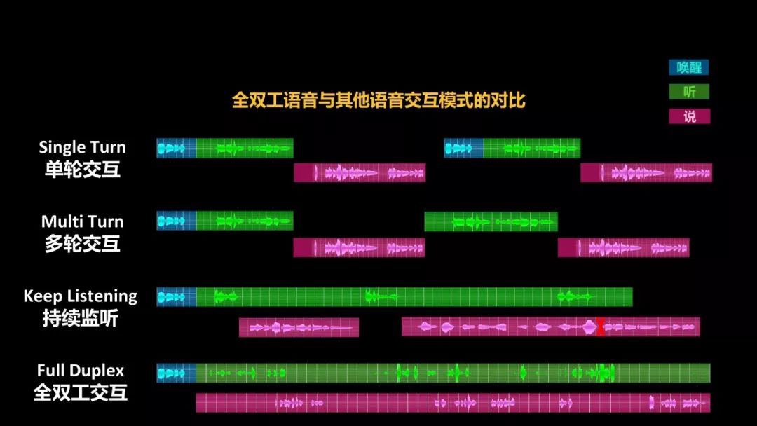 最后,其实像典型的科大讯飞,它尝试了一种叫AIUI的一种模式,它在试图去持续地监听用户发进来的语音消息,然后它每听到给出一个回答。但很可惜,这样的模式其实有非常大的缺陷,因为每播放一个回答,它其实都需要占用一定的时间。比如如果一个人连续问了两个问题的话,对于机器人可能第一个问题没回答完,第二个问题又出来了,就把原来第一个问题覆盖掉。这样的话,一个连续监听的模式事实上体验反而比之前的单轮交互、多轮交互要更差,会变得非常零乱,有的时候会让用户不知所措。这也正是为什么虽然科大讯飞应该在我们推出全双工的模式之后的不到半年,它就在叮咚音箱上给了一个小的开关,说你可以尝试我的一种新技术叫AIUI,但它其实从来没有敢在自己的产品里真正缺省地打开AIUI的模式,因为这里的问题太多了,它甚至还不如单轮交互,每一次让用户说一个唤醒词方便。