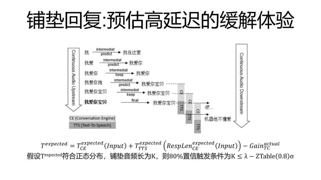 这里面一个优势就是,其实用户的这个“宝”字刚落下来的时候,经过一个简单的对策,对话的引擎就已经可以开始计算我应该怎么回答“我爱你宝贝”这句话,因为图中的这六条线都在进行平行的计算。等到它确定最后这三个平行的预测全都是正确的时候,它只需要等到这三个回答的计算中最快的那一个结果就可以了,因为它们算的其实都是同一个问题。这无形中就可以让人和AI进行语音交互时候,AI有机会能更快地去给你一个回复,而这个对于一个交互的自然度、流畅度是非常重要的。从我们后台的数据可以看到,哪怕机器的平均回答速度平均起来能快100毫秒,100毫秒其实对于人的感觉来说几乎是感觉不到的,会觉得1/10秒,人是感觉不到。但是只要AI的回答速度能快那么1/10秒的话,那么人类就会很明显地更愿意跟这个机器人聊得更长,我们可以通过像A/B test这样的东西能看到这样的结果。这个就是说,事实上对于人机的语音交互来说,速度是一个非常非常重要的环节。我们有了这种连续识别语音语言的预测,再加上平行的处理,就可以让机器,让AI回答得更快,也能让这整个人机交互变得更加流畅。