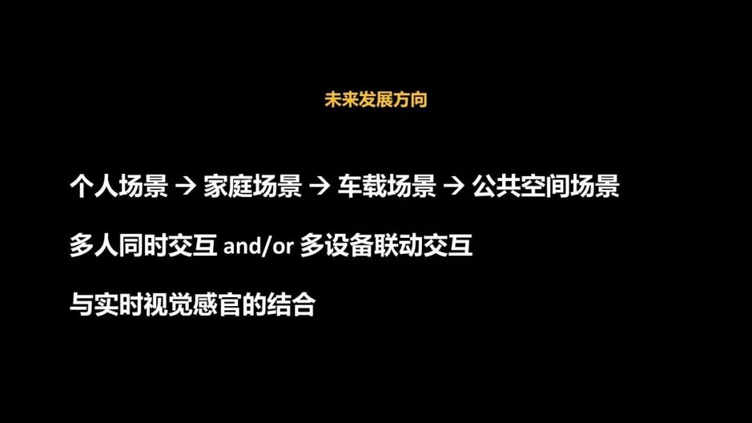 未来我们会有各种各样的发展方向,我们会从个人的场景,比如说打电话这是一个个人的场景,家庭的场景就是我们现在已经发布的Yeelight盒子,车载场景也是我们发布的。但是再往前走可能在公共场合,比如说一个商场里有一个导购的设备或者有一个大屏幕的设备,甚至说也许未来的某一天,我们试衣的模特是这样,也可以跟你进行交互,但是商场里可能不光你一个顾客,有很多其他的顾客,在公共的场景中他的交互会变得更加复杂。如果你家里同时有多个人,多台设备,他们之间的联动也会非常复杂。