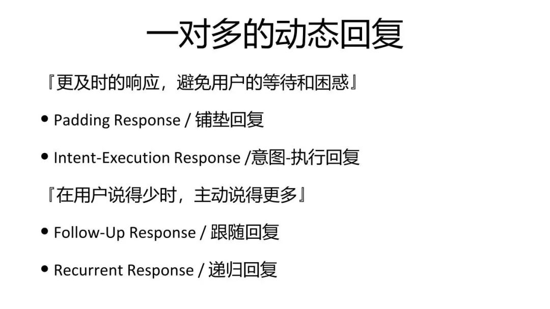 还有更多,比如当一个用户说“我好无聊,你给我讲一个笑话吧”,这个时候人工智能给他讲了一个笑话。讲完笑话之后,它听到用户沉默了,他可能还不高兴,它事实上可以过了几秒钟之后说,“那我再给你讲一个吧”,我可以再讲第二个、第三个,直到用户再说些什么或者说AI自己也觉得无趣了,它再断开。我们可以认为一个主回复中,其实后面可以再挂着很多额外的回复,如果用户没有反应的话,我可以源源不断地把它播出来。