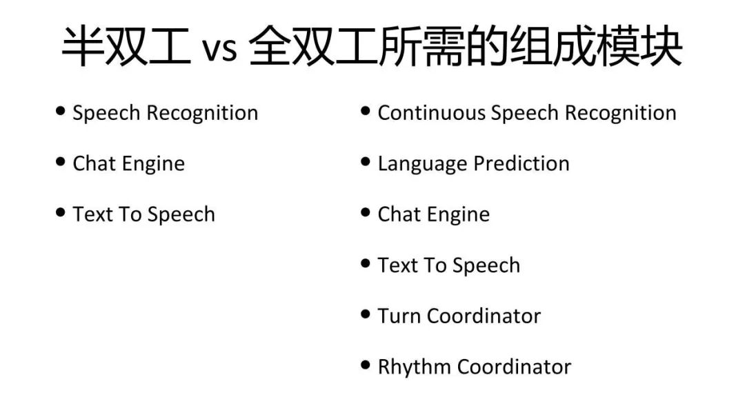讲这么多,大家可能稍微吊起胃口说如果能实现全双工的这样一个人机对话,可能是一个很美妙的东西,但是这个里面会遇到很多的技术难题,我现在跟大家一一分析说如果我们想实现全双工,那么它这里边需要有什么?