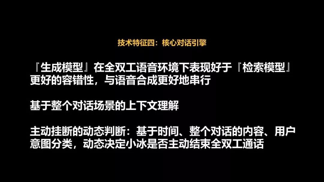 最后,如果我们想做一个全双工的语音对话的话,很重要的我们必须要有一个核心对话的引擎,它其实也是微软小冰从2014年发布以来,可能最为广大用户所熟知的强项,就是它的通用的语音对话的能力。那么我们在这个里面也就是说微软小冰的语音对话技术,其实最开始我们使用的是检索模型,就是用一个像搜索的方法,把人类以前说过的话用搜索的方法来寻找一个答案。在大概两三年前,渐渐地去转向由深度学习进行的生成模型。至今比如说我们在像微信、QQ,或者那些以消息进行交互的平台上,我们至今使用的是检索模型和生成模型的一个混合。但是在全双工语音环境下,事实上我们发现单纯地使用生成模型它的效果更好。这里边主要的原因是检索模型,大家学过搜索的话,它其实是对一些特别不常见的生僻的词最敏感,哪个词TFIDF最高,它实际上在搜索上就表达得非常显著。但是,对于语音识别引擎来讲,它如果不小心犯一个错误,实际上确实有可能把一个很常见的话,由于我说的不太清楚,经常大家会看到把一个常见的东西会错误地识别成一个不那么常见的东西。由于检索模型它天生的特性,事实上它可能会放大语音识别的错误。而生成模型,由于它深度学习,事实上还是主要学习它一些常见的模板,它对于语音识别结果的容错性会更高。这其实也是微软小冰从对话到全双工语音的探索中得到的一个非常有趣,也希望能跟大家分享的一个经验。