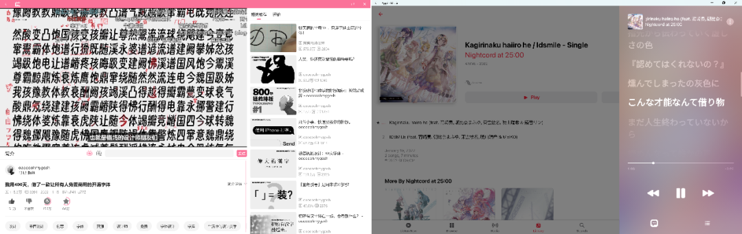 我使用影音软件主要是:1. 播放 Bilibili 视频;2. 听网易云音乐;3. 听 Apple Music。这三者表现都很好,下面一个一个说。Bilibili 网页端只能调用 B 站自己做的 WASM 软解,CPU 直接跑满,非常不建议网页,更推荐用 Microsoft Store 能搜到的 Bilibili UWP 版客户端,功能全面、支持硬解、符合平板操作逻辑,好评。网易云音乐只提供桌面版客户端,于是我找来了网易云音乐 UWP 不更新版 ,部分 API 已被弃用,测试下来必须通过 QQ 登录才能登上,好在听歌没问题。Apple Music 我习惯使用 Android 版,WSA 推出那天已经在电脑上装好,体验无比优异,并且 Apple Music 的 Android 端还做了平板适配,不亚于 iOS。B 站 UWP 与 Apple Music WSA