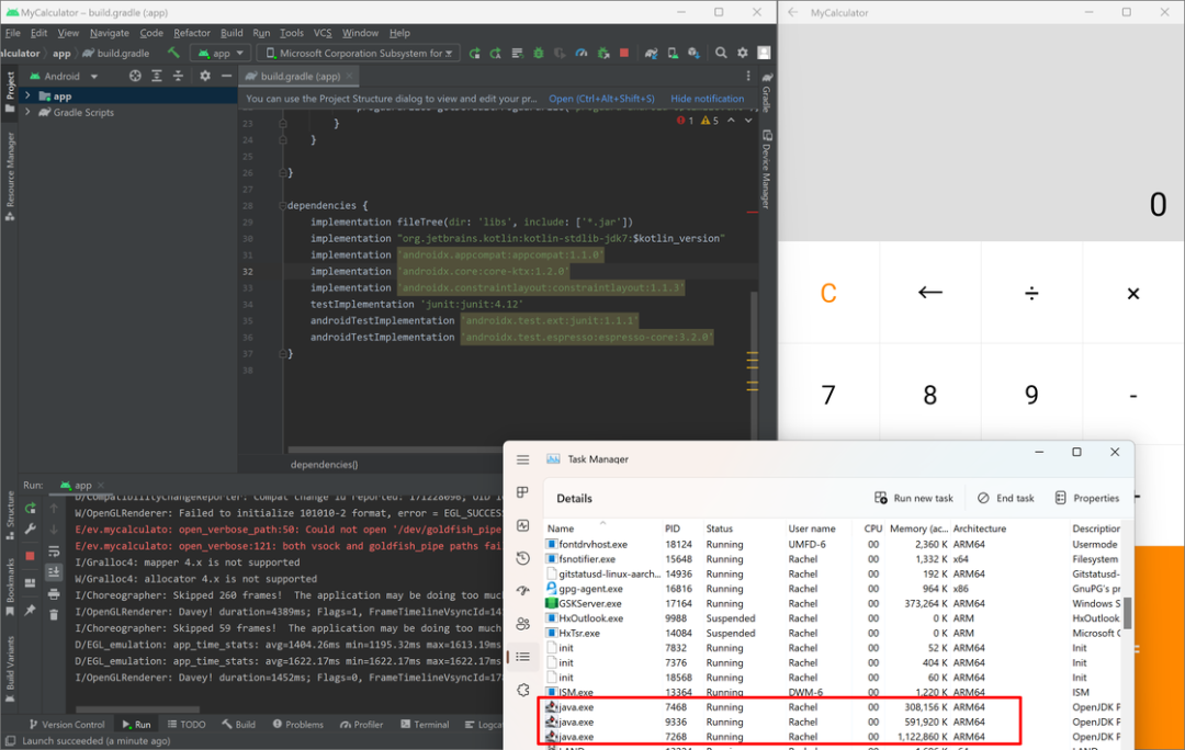 拿到 Surface Pro X 不久之后,完全支持 ARM 的 Visual Studio 2022 正式发布,对于 VS 用户,或者企图在 ARM 设备上用原生工具链编译原生应用的开发者来说都是个好消息。不过很可惜,我不是 Visual Studio 用户,没有对它进行详细测试,仅在编译 PyTorch 时体验了一把 MSVC,能用。有一点值得注意,即便有 ARM 版 MSVC,x86 / x64 版 MSVC 仍然是 C++ 开发必备依赖,一旦卸载会带着所有 C++ 相关组件一起自杀,非常迷惑。我主要熟悉 Visual Studio Code 和 Android Studio。前者和 Typora 一样基于 Electron,支持起来毫无压力,官方早就提供了 ARM64 版本安装包,插件也没大问题。Android Studio 只提供 x64 版本,但它基于 IntelliJ IDEA,理论上可以手动替换运行时,比如微软提供的 ARM64 版 OpenJDK 。初步尝试发现,用来编译不错,将它作为 AS 运行时后快捷方式无法启动,需要通过 AS 安装目录下的 studio.bat 打开。此外,OpenJDK 17 会报缺少 sun.awt ,得用 OpenJDK 11。AS 默认安装的模拟器及镜像是 x64 版本,在没有支持 ARM64 的情况下倒是合理,可是这不是明摆着坑人来的吗……尝试启动虚拟机会直接报 terminated,考虑到虚拟机针对 x86 设计倒也合理,好在 adb 正常,至少能使用 WSA 或者 USB 连接移动设备进行调试。OpenJDK 运行 Android Studio,并使用 WSA 调试一些小工具补充在这里。Git for Windows、Gpg4win、win-gpg-agent 和 Snipaste 都不提供 ARM 版本,好在它们足够轻量,转译没什么压力。微软官方的 PowerToys 不用多说,早做好了 ARM 适配;Syncthing 本体提供 ARM64 版本,Windows 下的工具 SyncTrayzor 却没有,只能自己手动将 Syncthing 塞进开机启动,没有桌面通知和托盘图标告知同步进度,还得全局启用传统终端才能保证它不会一直挂着一个终端窗口……用起来没毛病,不挑剔了。