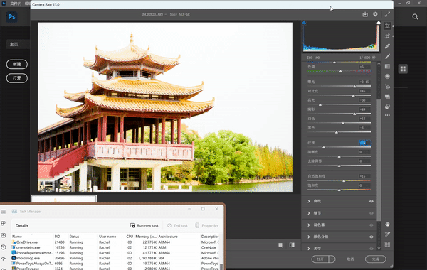 考虑到我每出一趟门都会生产一堆 RAW 文件,RAW 编辑是重中之重。好在「好用」说不上,对于简单处理,至少「能用」。Affinity Photo 只有 x64 版本,而且 RAW 编辑功能堪称残废,在试用中还会出现严重卡顿,并且调整参数后居然图片居然一块一块刷新,非常震撼,强烈不建议使用。还是看看远处的 Photoshop 吧家人们。Adobe 官方提供 ARM 版本,可惜太仓促所以没能用上,只体验了此前下好的 x64 版本。Camera Raw 相比新版缺很多功能,比如找半天都没找到蒙版在哪里,除此之外体验良好,功能都能用,卡顿在可以接受的范围内,不至于卡到图片一块一块刷新, Affinity 你看看你。x64 已经如此,ARM64 想必非常好用,不过得等后面进一步尝试才能知道了。Photoshop 2021 x64 Camera Raw
