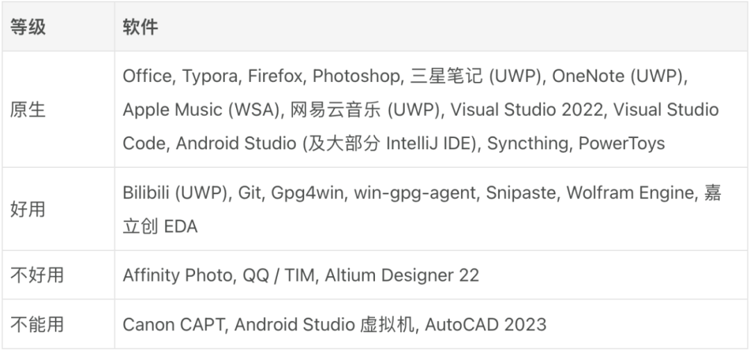 故事还得从 2020 年 11 月的那场 Apple 发布会说起——那天,M1 芯片正式发布 ,ARM 芯片的笔记本电脑飞入寻常百姓家,同时也以超高能效和超长续航一举成名,彻底改变了大家对 ARM 的印象。 所以在偷偷嘲讽 Mac 用户没游戏玩的同时,我内心也不免好奇:这是什么来自西方的神秘魔法?ARM 桌面处理器居然这么神奇?也正是在这个时候,搭载 ARM 处理器的 Windows 设备正式进入我的视野。Apple 对于穷学生来说实在是太遥不可及了。当时我才刚入手上一台笔电五个月,对它抱有相当多的好感,不过各种渠道听说 ARM Windows 笔记本搭载的 Windows on ARM(下称 WoA)还是个半成品、不适合作为主力,于是萌生的想法被搁置。这样一拖就直接拖到了 Apple 发布会两年后的另一个 11 月,当我发现手持笔电的二手价格已经跌到不堪入目、我的笔记本使用需求也逐渐轻量到「能办公就行」的时候,我知道也是时候做出改变拥抱一点新东西了。心一横,一天后到手一台 Surface Pro X。本文是对我在它磨合的过程中,写下的一点记录与思考。能用了吗?▍太长不看:能用了吗?能用了,甚至很好用。许多软件都提供 ARM 支持,x64 软件通过转译也能正常运行,除 Canon 的打印驱动外几乎没有不兼容。这里是常用软件及 Windows on ARM 体验对照表,后面体验部分有各种场景的综合体验评分,可以作为参考。▍硬件:你这电脑是 i7 还是 R7 啊?都不是。这台 Surface Pro X 搭载了骁龙 8cx 换皮版:微软 SQ1 SoC,有四颗 Cortex-A76 大核和四颗 Cortex-A55 小核,基于台积电 7nm 工艺打造,约为天玑 1100 或者 Apple A11(iPhone 8 / X)水平;GPU 是高通 Adreno 685,855 上那颗 Adreno 640 的超级加倍版,微软说运算速度可达 2TFlops,极限性能略高于 Apple A14 (iPhone 12 / iPad Air 4)。此外它还拥有 16GB 板载内存,256GB 可更换 M.2 SSD 以及 X24 LTE 基带,可插 SIM 卡保持随时在线。装系统前的 Surface Pro X 定妆照,左半部有亮斑微软对 Surface Pro 系列的定位是二合一笔记本,Surface Pro X 自然没有免俗,和家族其他成员一样,它本质上是一台可接磁吸键盘的平板,拔下键盘随时变身 iPad Pro Max。这种设计有好有坏,好处是本体发热不会影响键盘输入,同时更灵活,可以针对场景随意切换,坏处是磁吸键盘 + 屏后支架设计导致整台笔记本压力全都加在支架上,压强很大,并且没有常规笔记本转轴稳定,以至于每次把 SPX 放在腿上打字,腿都会被摁出压痕;并且不能直接端起键盘换姿势,非得全部抓起来一起挪,完事儿了还得把手伸到屏幕后调支架。Surface 的品控也一如既往垃圾,我这台屏幕有明显亮斑,好在据上家说它并没有扩散。当然品控之外大多都是个人习惯差异,渡过适应期就好——它搭载的系统更值得关注。▍系统:你这平板系统是 iOS 还是 Android 啊?也都不是,毕竟如标题所示,这是一台搭载 Windows 的 ARM 笔记本。「极其先进」的 ARM 和 SQ1这并非 Windows 首次与 ARM 结合。先不说 Windows Phone,早在 2011 年,微软就宣布了运行在 ARM 处理器上的 Windows PC ——那还是乔布斯年代。不久后,Windows RT,一款为 ARMv7 架构开发、不兼容 x86 和大部分桌面应用、只能使用商店或自带软件的系统随 Windows 8 一起发布。可想而知,作为 Windows 兼容性高位截瘫等于自杀,Windows RT 设备除首发五台外只有微软自己做了两台,发布仅一年后它们纷纷大幅降价,几乎退出历史舞台。好在微软并没有因此挫败太久。2016 年末,微软宣布将与高通合作,在 2017 年将 x86 模拟带给 ARM 设备。尽管它如约而至,x64 应用运行能力的缺失,在不少生产力应用都主推 64 位时,成为了足以影响用户选择的遗憾;好在随 Windows 11 发布,x64 模拟正式释出,ARM 笔记本发展最后一道障碍终于被解决。Win11 还带来了 Windows Subsystem for Android(下称 WSA),通过 Hyper-V 虚拟机能直接在 Windows 中运行 Android 应用,ARM 设备应用生态自然也大大扩展。应用没问题,游戏呢?事实上,原生支持 WoA 的游戏已经有数百款 ,虽然比起 Steam 庞大的游戏库来说九牛一毛,并且 Windows RT 历史遗留也在其中,但至少说明 ARM 没有被游戏世界抛弃。通过转译,部分非原生游戏能在 ARM 设备上顺利运行,得益于高通强大的 GPU 性能,还能跑得挺好。去年,微软推出 ARM64EC ,无需重构所有代码,可直接混合开发 x64 与 ARM64 应用,编译结果可以同时在 x64 和 ARM64 设备上运行。它允许开发者优先转换对性能影响最大的部分,剩余部分直接交给转译,大大提高开发效率;上半年 Build 大会上,微软宣布了一系列对 ARM 的方案,其中 Project Volterra,基于骁龙 8cx Gen 3,配备 32+512GB 仅售¥4000 出头的 Windows 开发者套件,已在不久前正式发售,可以查阅微软员工的评测。可以看出,失败经历并没有影响微软推广 ARM 的决心,不过「不看广告看疗效」,在祭出这么多大招之后,WoA 实际体验究竟如何?▍体验:你这 Windows 平板好用吗?「好不好用」更偏向于主观评价,与不同人群对笔记本的要求息息相关。因此这一部分将从不同方面,描述我这段时间不同场景的使用体验。同时每节标题都有一个打分,作为主观粗略评价。