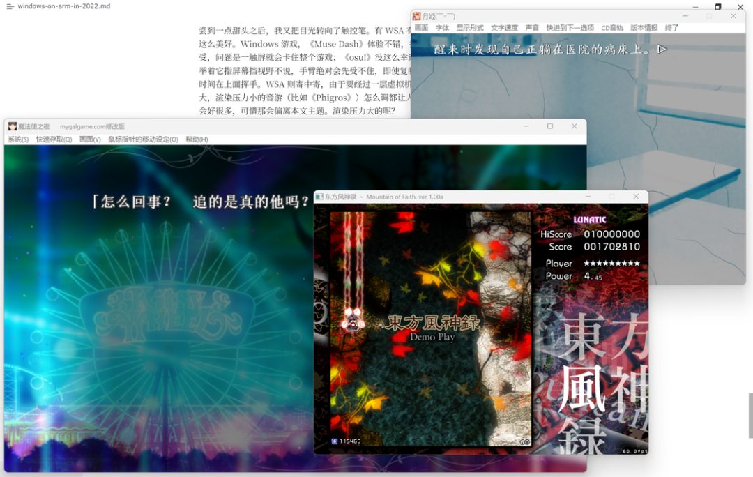 这话题可非常复杂。市面上游戏种类众多,从 3A 大作到轻量小游戏,游戏引擎花样百出,加上 WSA 进一步扩充游戏库,不可能穷尽所有游戏,我只能根据接触到的游戏种类,在此提供一点参考。首先排除各类通过注入驱动来反作弊的网游,比如原神、崩坏 3 和 LOL。它们驱动都是为 x86 系统准备,所以非常遗憾,到此为止。既然是平板,那不得不提 Galgame。测试中,基于 Kirikiri 和 Ren'Py 的游戏毫无兼容性问题,直接打开即可游玩。然而,可能是受限于 SQ1 孱弱的性能,《魔法使之夜》在复杂场景掉帧严重,尤其是游乐园之战高潮部分,连文字都卡成 PPT,查看占用发现 CPU、GPU 和内存占用率都不高,估计是单核性能受限,加上系统调度或者游戏优化不佳导致。好在对性能要求如此高的 Kirikiri 游戏,估计仅此一家。Ren'Py 打开时有一段漫长等待时间,在没有安装 DirectX 运行时的情况下运行起来较为流畅,除动画场景掉帧外,体验甚至优于 LG Gram,安装后更是丝滑一大截。此外,Kirikiri 和 Ren'Py 都是开源引擎,Ren'Py 游戏还自带一份 Python 环境,可以自编译或者将 x86 / x64 环境替换为原生 ARM64 以获得更高性能,不换跑起来没问题,所以我没进一步尝试。尝到一点甜头之后,我又把目光转向了触控笔。有 WSA 有触控,用来玩音游岂不美哉?事实却没有这么美好。Windows 游戏,《Muse Dash》体验不错,掉帧少,延迟约在 60ms 左右,可以接受,问题是一触屏就会卡住整个游戏;《osu!》没这么幸运,疯狂掉帧,触控笔也没想象中好用,举着它指屏幕挡视野不说,手臂绝对会先受不住,即使复制一份屏幕出来,SPX 的尺寸并不适合长时间在上面挥手。WSA 则寄中寄,由于要经过一层虚拟机,触控延迟本来就高,这下被进一步放大,渲染压力小的音游(比如《Phigros》)怎么调都让人难以适应,据说 Linux 下用 Waydroid 会好很多,可惜那会偏离本文主题。渲染压力大的呢?当然更不可能。WSA 图形效率很低,什么游戏都得卡。《明日方舟》切换界面时会带着整个系统一起卡,连系统音频输出都会爆炸,稳定下来后也很难满帧运行,更别说其它要求更高的 Android 游戏了。高通驱动和微软转译至少有一个背锅,考虑到即使是 5600x + 2060 都跑不动 WSA《明日方舟》,很有可能这俩都要背锅。可惜 ARM 端目前除 WSA 和部分开发用虚拟机外,没有像 Bluestacks 那种专为游戏设计的虚拟机,期待出现后会稍微好一点。接下来是怀旧时间——《东方风神录》在测试中表现非常好,全程跑满 60 帧,预计整个东方系列都会表现不错。两个同人奇迹和两个型月当家花旦的合影整体看来,在「轻薄本不会用来玩大型游戏」的前提下,Windows on ARM 交出的答卷还过得去。其他游戏在短暂体验中没来得及详细测试,而且我手上这台 SPX 只有 256GB SSD,塞满开发中间体时没办法测试太多,据前任机主说,《CS:GO》跑到 60 帧上下,能玩。很巧,拿到 SPX 不久后, DXVK 发布了 2.0 大版本更新。考虑到高通这颗 SoC 是基于手机芯片发展而来,它的 Vulkan 图形驱动性能可能会优于 DirectX,不过碍于篇幅所限,进一步测试就留待日后再说吧。▍ARM + Windows,路在何方现在这篇碎碎念终于进入最后阶段,按照惯例,该装模作样地展望一下。Windows on ARM 已经足够好用,却还有一些不可忽视的问题。它们有些是因为微软和(尤其是)高通不作为,有些是因为社区缺乏活力,更多则是这二者的叠加。目前,大部分 WoA 用户可能只是浅尝辄止,因为赚钱家伙用不爽;之所以用不爽,一部分是高通芯片性能太差驱动不行,一部分是用户基数小屎山高开发者懒得适配,另一部分则是微软作为开发者背刺狂魔,推广什么都让人不敢冒进。性能、驱动差,适配应用少,又进一步让用户望而却步;如此循环往复下去,未来 WoA 越来越小众,说不定最后沦为另一个 Windows Phone。但是,如果像微软现在说的那样,ARM 真要成为未来,那任重而道远。微软的决心大家有目共睹,只是 Windows 不像 Linux 和 macOS,后二者推广 ARM 几乎没有阻力、没有历史包袱,而 Windows 在兼容性拖累下积重难返,拥抱 ARM 也依旧有大量 x86 历史残留。例如,前文提到 PyTorch 的小问题,主要原因是默认运行 MSVC 一定是 x86 设备,直接调用了一条 ARM 不存在的 CPU 指令,一跑就炸。这样的代码多如牛毛,靠一个人、一个组织很难解决,需要活跃的开发者群体、Windows on ARM 进一步普及,以及足够长的时间。此外,ARM 阵营除 Apple 外,至今仍没有其他玩家拿出强力芯片,WoA 设备还只能由高通造 SoC,同时 x86 生态硬件(比如显卡)在 WoA 上没有驱动、无法运行——性能上起不来,ARM 取代 x86 更加遥遥无期。ARM 到底是未来吗?很难断定。它可能在很长时间内与 x86 共存,可能再过几年就退出历史舞台。这几天使用下来,被动散热、长续航和轻薄兼具的 Surface Pro X 给我留下了不错的印象,希望 WoA 能走得再久一点,希望我能看到 ARM 真正站起来,看到我可以不再当一个吃螃蟹的人,而是像普通用户那样,从来如此般使用 Windows on ARM 的那一天。原文链接:https://sspai.com/post/76849?utm_source=wechat&utm_medium=social 作者:RachelT 责编:克莱德