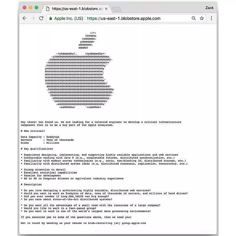 腾讯科技编者按:据国外媒体报道称,苹果不久前通过一个隐藏的页面招募一名从事“关键基础设施组件”的工程师。具体来说就是,苹果在地址为“us-east-1.blobstore.apple.com”的网页中植入了一个招聘需求,用户只需要在浏览器中输入这一地址就会跳转至一个不易被发现的工作招聘页面。