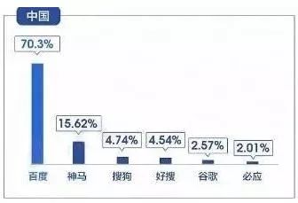 据Statcounter最近发布的中国移动搜索引擎市场份额报告,中国区搜索引擎市场份额排行中,百度独占鳌头,至今仍是国内搜索引擎巨头,市场份额高达70.3%。神马搜索市场份额提升至15.62%,搜狗搜索占4.74%,360搜索(好搜)占4.54%。