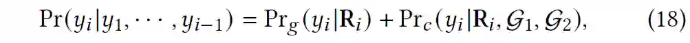 我们进一步使用复制机制增强被推荐的item、相关实体与描述性关键词的生成,最终的下一个符号   的预测公式如下: