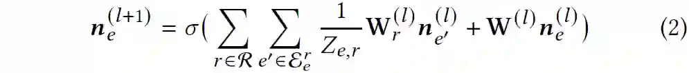 本文使用R-GCN[6]学习DBpedia上item的表示。节点 层的表示通过如下公式计算: