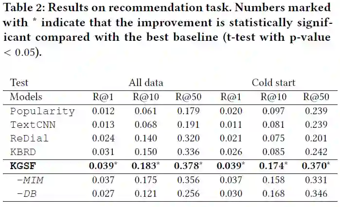 本文在ReDial数据集上进行了实验,并且对比了KGSF模型与基线算法的性能。按照对话推荐领域的惯例,本文在推荐任务和生成任务上分别进行实验和分析。