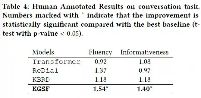 从图中可以看出,KGSF模型在所有评估指标上始终更好。