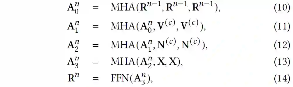 其中 定义了多头注意力函数,  定义了一个全连接前向传递网络,   是编码器的嵌入矩阵输出,   和   都是知识图谱增强后的表示。  是解码器第   层的嵌入矩阵。
