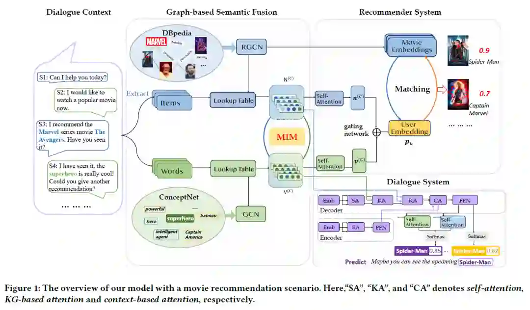 本文将对话系统和推荐系统中基本语义单元分别定义为word和item,使用两个独立的知识图谱来增强两种语义单元的表达。