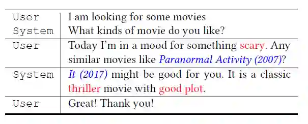 虽然这些研究在一定程度上提高了CRS的性能,但仍有两个主要问题有待解决。首先,会话主要由几句话组成,缺乏足够的上下文信息,无法准确理解用户的偏好。如上表所示,一个用户正在寻找类似于“Paranormal Activity(2007)”的恐怖电影,其中用两个短句子描述了他/她的偏好。为了获取用户的内部信息,我们需要充分利用上下文信息并对其建模(e.g. 理解单词“scary”和电影“Paranormal Activity(2007)”背后的语义)。显然,单凭对话文本很难获得这样的事实信息。第二,对话内容用自然语言表示,而实际用户偏好则反映在商品或实体上(例如,演员和电影类型)。这两种数据信号之间存在天然的语义差异。我们需要一种有效的语义融合方法来理解或生成对话内容。如上表所示,如果不能拟合语义上的鸿沟,就无法生成解释推荐的文本(e.g. “thriller movie with good plot”)。