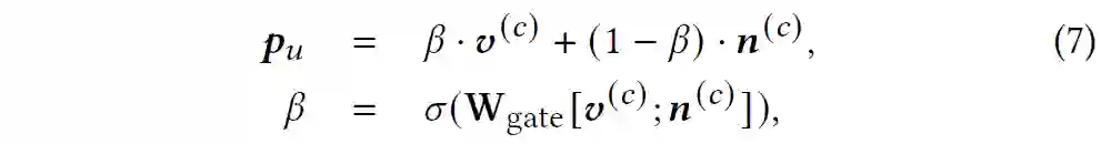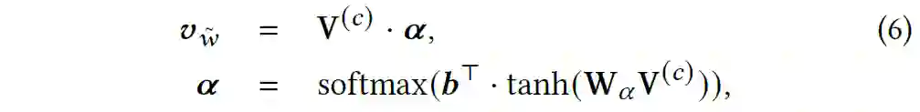 其中  是通过与公式6类似的自注意力机制在会话上下文上获得的的单个词向量,  同理。